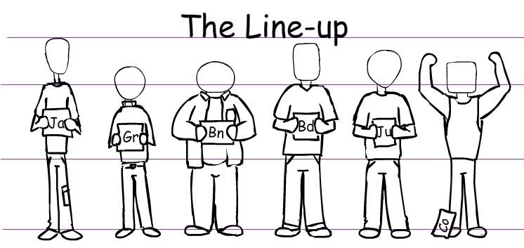I know it wasn't required, but the bodies felt too stiff to be my characters, and I wanted to play with the mistaken-theme of the original picture, so I moved some limbs, and had them hold signs for their names. I don't know why I use this periodic table-style naming convention.